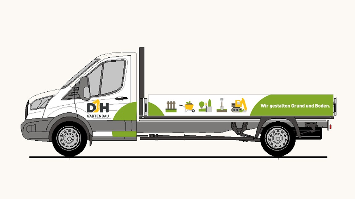 DH Gartenbau ist ein junges, schnell wachsendes Unternehmen mit umfangreichem Leistungsangebot. Von Achtender kommt das komplette Corporate Design mitsamt Ikonografie und Fahrzeugbespielung.