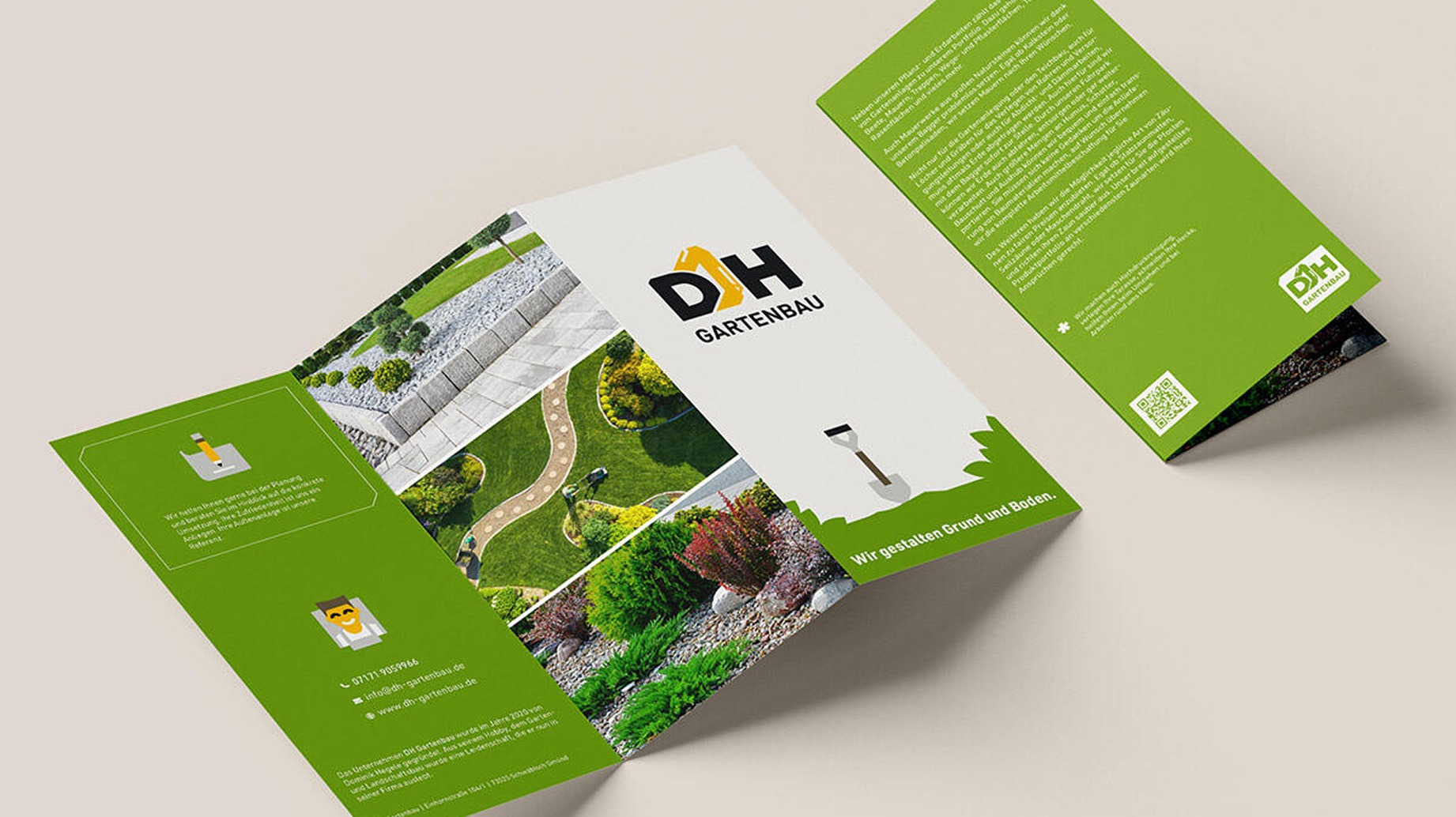 DH Gartenbau steht für Qualität, Dynamik und Leidenschaft für das Handwerk. Das Design sollte diese Werte auf den ersten Blick sichtbar machen. Mit einer klaren Formensprache, prägnanten Farben und individuellen Icons entstand ein Erscheinungsbild, das sowohl sympathisch als auch professionell wirkt.